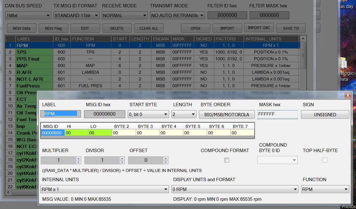 What might be a little more helpful, is the CAN config Plex Tuning use for their SDM dash displays etc. Here is the first item RPM and how it is configured, it shows more data but they will all follow a similar pattern.